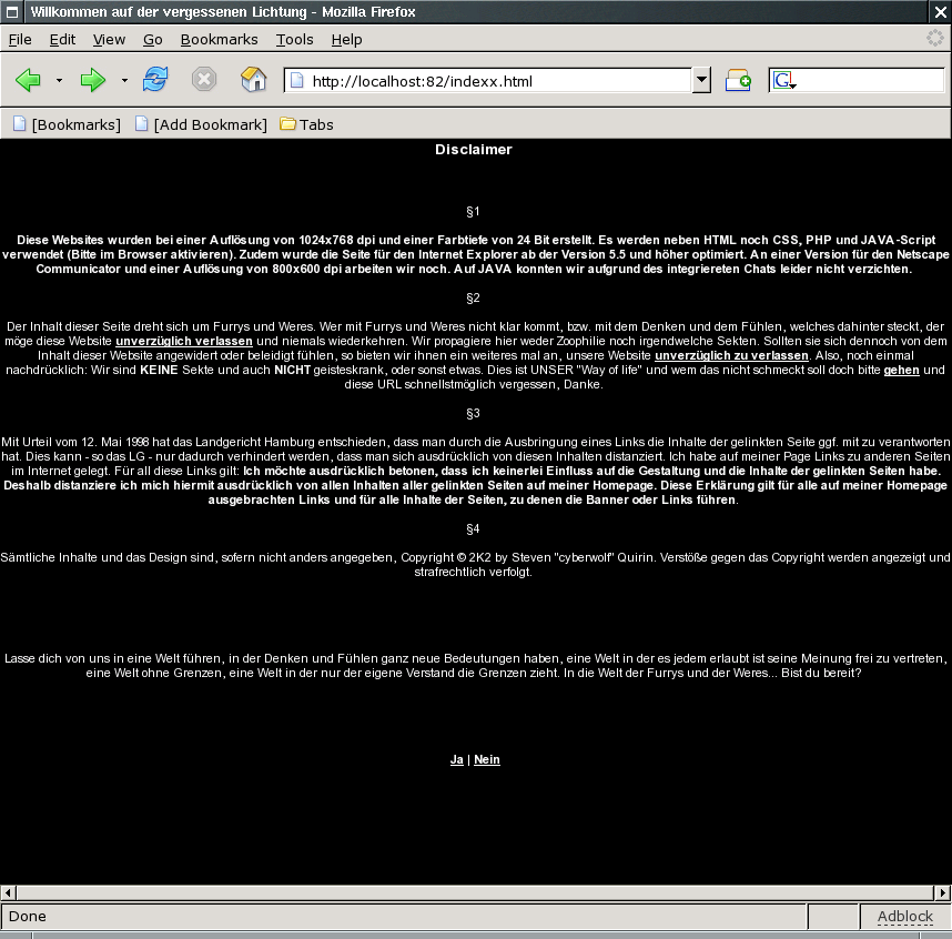 Ich will mich nicht lange mit den formalen Dingen aufhalten, aber ohne eine Kritik der Präsentation komme ich hier nicht aus. Die Vergessene Lichtung, der Titel alleine ist schon der alberne Versuch einer Provokation gegen Die Lichtung (Archiv). Nach einem überflüssigen Splash-Screen wurde der Besucher auf eine Seite voller Paragraphen mit Nutzungsbedingungen geleitet -- ich habe mir die Freiheit genommen, diese zu parodieren. Dies allein sollte eigentlich schon jeden potenziellen Leser abschrecken. Und zwar alleine durch ihre Albernheit. Sorry, wer etwas ins Web stellt, ist auch dafür verantwortlich und kann sich nicht mit Einschüchterungen und Haftungsausschlüssen der Verantwortung, oder auch nur der Kritik, entziehen. Lassen wir mal die Neugierde siegen und lassen wir uns also in eine Welt führen, in der angeblich "Denken und Fühlen ganz neue Bedeutungen haben".