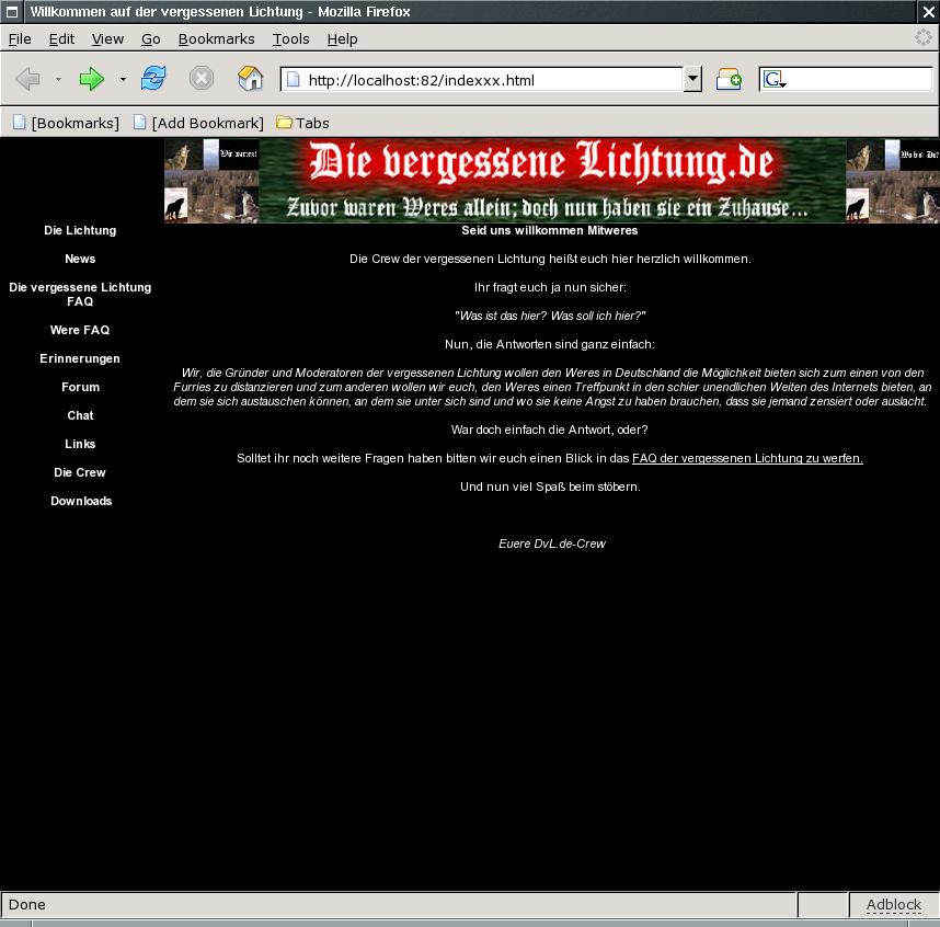 Es begrüßt den Leser also eine Leitseite, weiße Schrift (winzig kleiner Arial-Font ohne Alternative) auf schwarzem Grund, als ob der Autor das Ableben eines guten Freundes betrauert. Vielleicht ist es aber auch nur der Realitätssinn, der hier abhanden gekommen ist. Über der Seite thront ein Banner mit dem Titel der Seiten in glühender Pseudo-Fraktura, und dem Untertitel "Zuvor waren Weres allein; doch nun haben Sie ein Zuhause..." Eingerahmt das ganze von zwei Fotomontagen, die wieder ein verfehlter Seitenhieb auf eine Logo-Grafik Der Lichtung zu sein scheint.